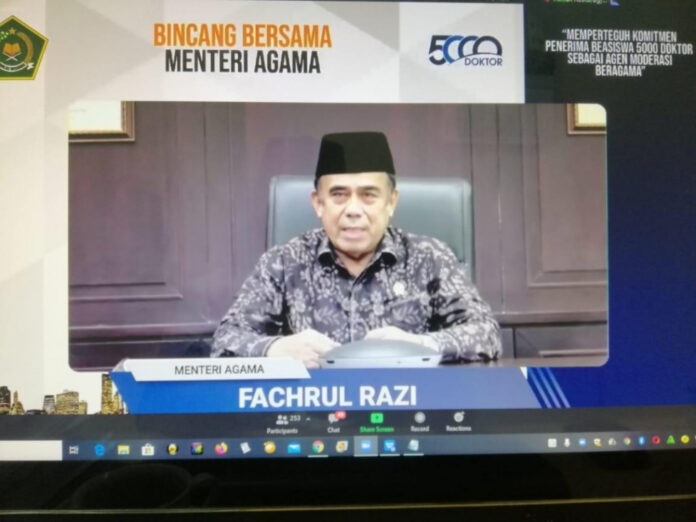 Hal ini disampaikan Menag dalam gelaran webinar Bincang Mahasiswa Penerima Program Bantuan 5000 Doktor Luar Negeri. Kegiatan ini mengusung tema Memperteguh Komitmen Penerima Beasiswa 5000 Doktor Luar Negeri Sebagi Agen Moderasi Beragama.