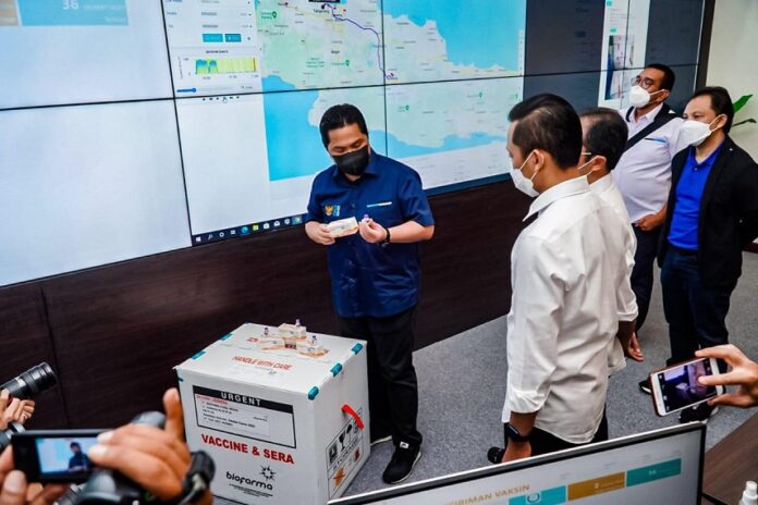 Didampingi Direktur Utama Honesti Basyir, Menteri Erick Thohir meninjau command center – tempat memonitor data produksi, penyimpanan dan distribusi secara realtime berbasis teknologi IoT (internet of things) – fasilitas produksi, dan penyimpanan vaksin COVID-19 di Bio Farma.
