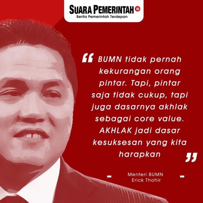 “BUMN tidak pernah kekurangan orang pintar. Seperti senior saya Pak Tanri Abeng dan Pak Dahlan Iskan. Tapi, pintar saja tidak cukup, tapi juga dasarnya akhlak sebagi core value,” ungkap Erick saat meluncurkan buku AKHLAK Untuk Negeri, pada Rabu (6/1/2021).