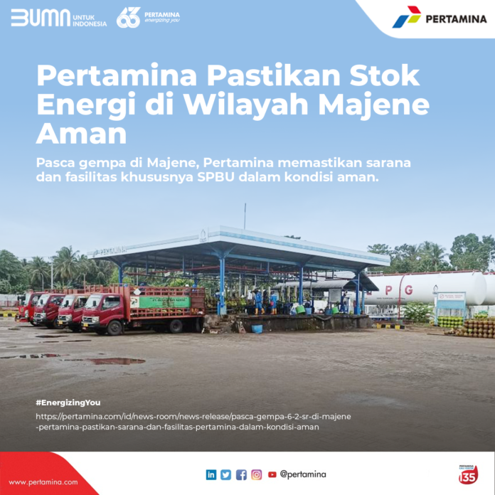 SuaraPemerintah.id – Pasca kejadian gempa bumi berkekuatan 6,2 SR yang mengguncang Kabupaten Majene, Sulawesi Barat dan sekitarnya pada Jumat (15/1) 01.28 pagi WITA, Pertamina dengan cepat memastikan penyaluran BBM dan LPG tetap aman termasuk sarana dan fasilitas (sarfas) khususnya Stasiun Pengisian Bahan Bakar Umum (SPBU) Pertamina di wilayah Majene dan sekitarnya.