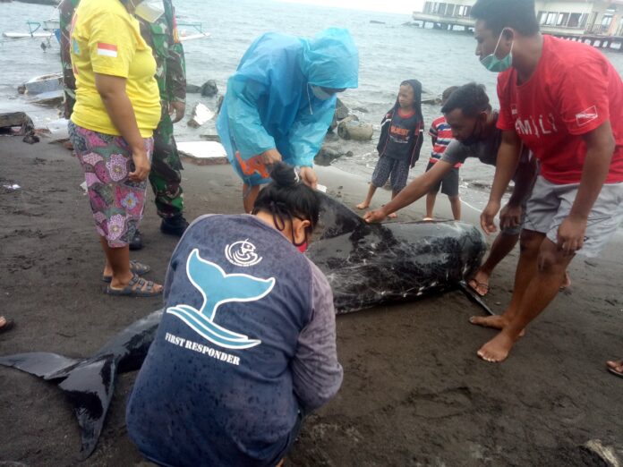 Paus pembunuh kerdil yang ditemukan berukuran 2,5 meter berjenis kelamin betina. Kondisi paus sudah dalam keadaan mati pada Jumat (5/2/2021) atau disebut juga kode dua (2) dalam penanganan mamalia terdampar.