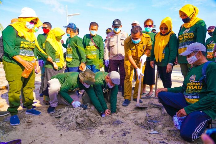SuaraPemerintah.id – Dalam rangka Hari Pers Nasional (HPN) 2021 yang diperingati setiap tanggal 9 Februari dan HUT Persatuan Wartawan Indonesia (PWI) ke-75, Balai Pengelolaan Daerah Aliran Sungai dan Hutan Lindung (BPDASHL) Indragiri Rokan Kementerian Lingkungan Hidup dan Kehutanan (KLHK) bersama PWI Riau melakukan penanaman pohon di sepanjang pantai Pesona, Rupat Utara, Kabupaten Bengkalis, Provinsi Riau, Senin pagi (08/2).