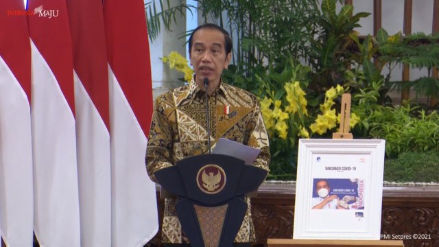 Pada kesempatan itu, Presiden Jokowi didampingi Menkominfo Johnny G Plate menandatangani sampul hari pertama Prangko Seri Gerakan Vaksinasi Nasional Covid-19.
