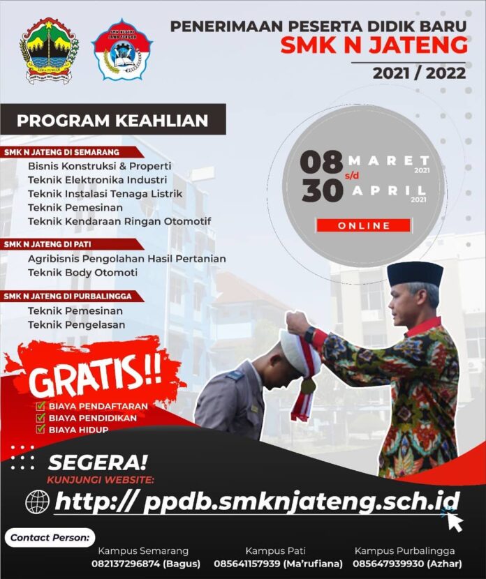 SuaraPemerintah.id – Pemerintah Provinsi Jawa Tengah membuka Penerimaan Peserta Didik Baru (PPDB) Sekolah Menengah Kejuruan (SMK) Negeri Jateng tahun ajar 2021/2022.