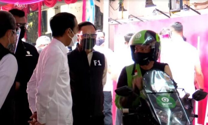 Pada kesempatan itu, terlihat Jokowi sempat berbincang dengan penerima vaksin. Mereka terlihat datang dari para pegemudi ojek online yang duduk dari motornya, dan satu lagi seorang bapak berbincang dengan Jokowi dari dalam mobil.