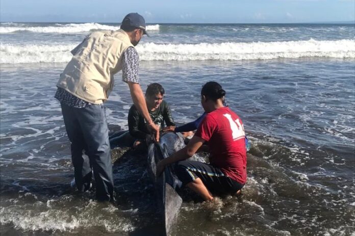 “Pukul 11,15 WITA masih berdenyut jantungnya namun sudah tidak merespon dan tidak bergerak. Terindentifikasi berukuran kurang lebih 3 meter, usia kira-kira 15 tahun, berjenis kelamin betina, ”jelas Yudi.