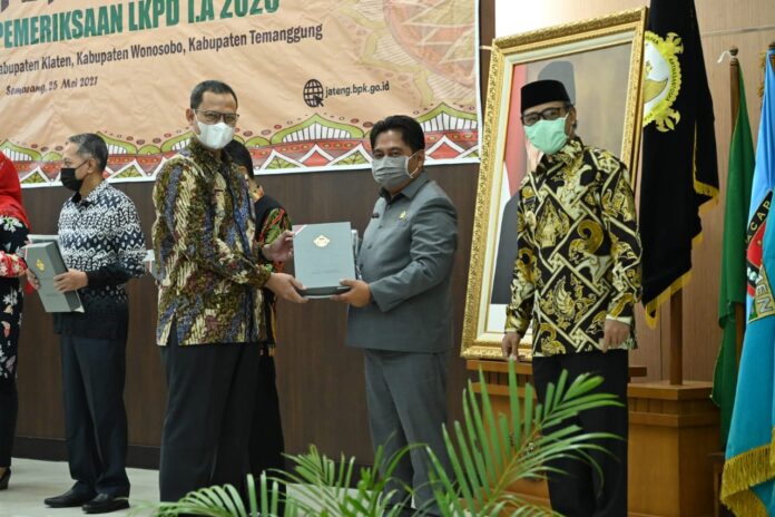 Piagam Opini WTP diserahkan Kepala Perwakilan BPK Provinsi Jawa Tengah Ayub Amali kepada Bupati Temanggung HM Al Khadziq bersama Ketua DPRD Yunianto yang juga turut hadir Sekda Hary Agung Prabowo, di Kantor Pewakilan BPK Provinsi Jawa Tengah, Semarang, Selasa (25/5/2021).
