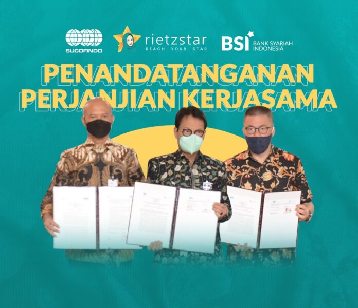 Kedua perjanjian kerjasama ini ditandatangani oleh Direktur Utama SUCOFINDO- Bachder Djohan Buddin, CEO Rietzstar-Basuki Kusuma dan Wakil Direktur Utama 1 PT Bank Syariah Indonesia, Tbk. – Ngatari yang turut dihadiri oleh Staf Ahli Bidang Keuangan & Pengembangan UMKM Kementerian BUMN – Loto Srinaita Ginting, Direktur Keuangan dan Perencanaan Strategis SUCOFINDO – Budi Hartanto dan Direktur Sumber Daya dan Pengembangan Bisnis SUCOFINDO – Rozainbahri Noor. Pelaksanaan penandatanganan ini bertempat di International Finance Center dengan mengedepankan protokol kesehatan.