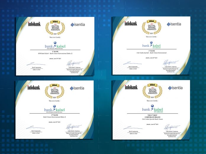 SuaraPemerintah.id – Bank Kalsel sebagai entitas bisnis daerah yang berkomitmen memberikan layanan terbaik kepada nasabah, kembali memperoleh apresiasi membanggakan. Bank dengan tagline “Setia Melayani, Melaju Bersama” ini dianugerahi penghargaan pada ajang “10th Infobank Digital Brand Awards 2021” atas keberhasilan Bank Kalsel dalam melakukan promosi produk atau jasa secara digital sepanjang tahun 2020.