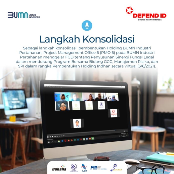 SuaraPemerintah.id – Konsolidasi dalam rangka perbaikan internal terus dilakukan dalam menyongsong pembentukan Holding BUMN Industri Pertahanan. Kali ini, Project Management Office 6 (PMO 6) pada BUMN Industri Pertahanan menggelar Focus Group Discussion (FGD) tentang Penyusunan Sinergi Fungsi Legal dalam mendukung Program Bersama Bidang GCG, Manajemen Risiko dan SPI dalam rangka Pembentukan Holding Indhan secara virtual pada Kamis, 3 Juni 2021.