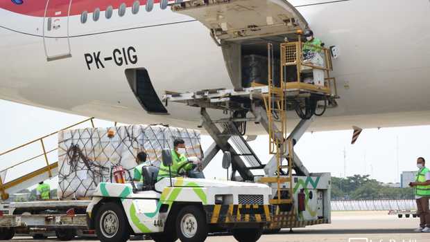 Vaksin tersebut tiba di Indonesia menggunakan pesawat Garuda Indonesia yang dikemas dalam 26 isolation box berukuran 110 cm x 100 cm x 157 cm.