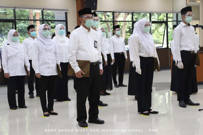 SuaraPemerintah.id – Kepala Badan Riset dan Inovasi Nasional (BRIN) Laksana Tri Handoko melakukan pelantikan dan pengambilan sumpah jabatan fungsional 27 pegawai secara daring dari Gedung BJ Habibie, Jakarta, pada Kamis (03/06). Para pegawai yang dilantik hadir secara langsung di Gedung Pusdiklat BRIN, Serpong, Tangerang Selatan, dengan berbagai bidang jabatan fungsional.