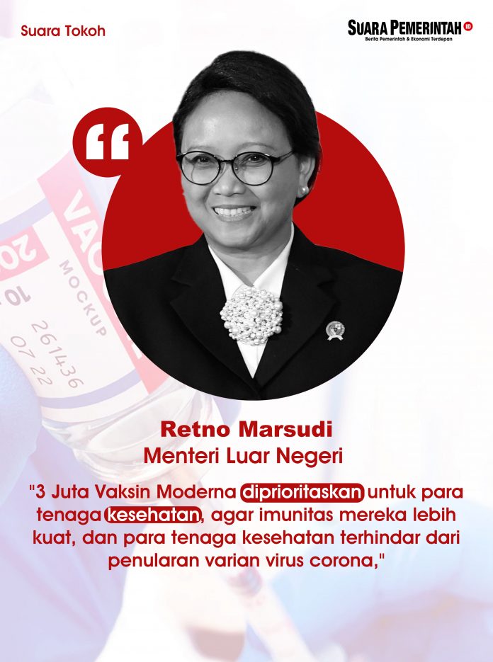 “Alhamdulillah hari ini menerima 3.000.060 dosis vaksin Moderna. Dukungan kerja sama internasional dari pemerintah Amerika Serikat melalui jalur multilateral Covax Facility,” Ujar Retno saat jumpa pers secara virtual, Minggu (11/7/21)