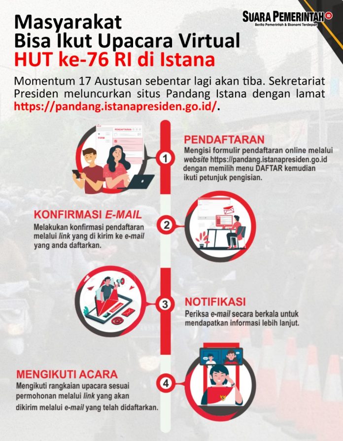 SuaraPemerintah.ID– Momentum 17 Agustus sebentar lagi akan tiba. Sekretariat Presiden meluncurkan situs Pandang Istana dengan lamat https://pandang.istanapresiden.go.id/. Kanal situs tersebut untuk memudahkan masyarakat Indonesia mendaftar menjadi peserta virtual saat upacara peringatan HUT Ke-76 Republik Indonesia di Istana Negara, Jakarta Pusat.
