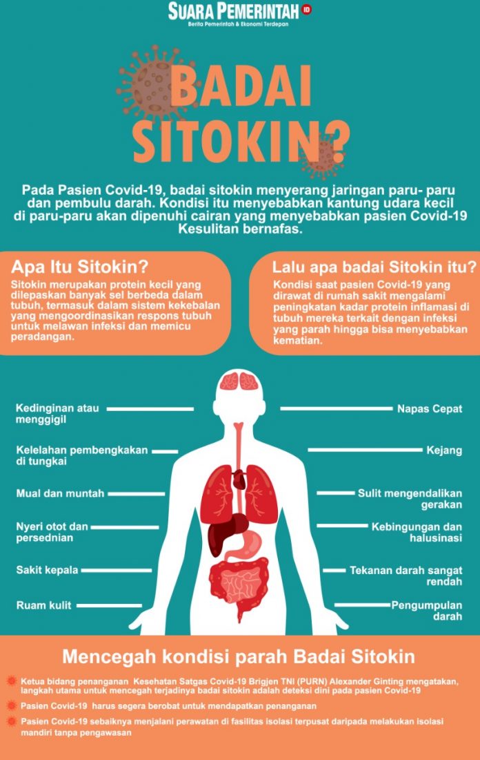 Sekedar informasi dikutip dari laman halodoc, badai sitokin merupakan salah satu komplikasi yang bisa dialami oleh penderita COVID-19. Kondisi ini perlu diwaspadai dan perlu segera ditangani secara intensif. Bila dibiarkan tanpa penanganan, badai sitokin dapat menyebabkan kegagalan fungsi organ hingga kematian.