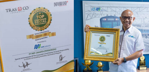 SuaraPemerintah.ID – PT MRT Jakarta (Perseroda) meraih penghargaan Top Corporate Social Responsibility of the Year 2021: Special Achievement for COVID-19 Handling Activities oleh TRAS N CO Indonesia dan INFOBRAND.ID. Penghargaan diterima langsung oleh Direktur Utama PT MRT Jakarta (Perseroda), William Sabandar di Kantor Pusat PT MRT Jakarta (Perseroda), Jakarta Pusat, Kamis (19/08/21).