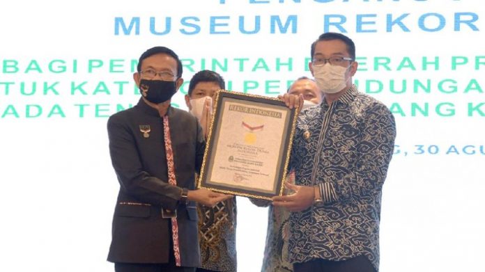 SuaraPemerintah.ID – Pemerintah Provinsi Jawa Barat (Jabar) terima penghargaan Museum Rekor Indonesia (MURI) dalam Kategori Perlindungan Program Jamsostek untuk Tenaga Pendidik Keagamaan Terbanyak Tingkat Nasional. Penghargaan ini diterima langsung Gubernur Jabar, Ridwan Kamil di Hotel Pullman, Kota Bandung, Senin (30/8/21).