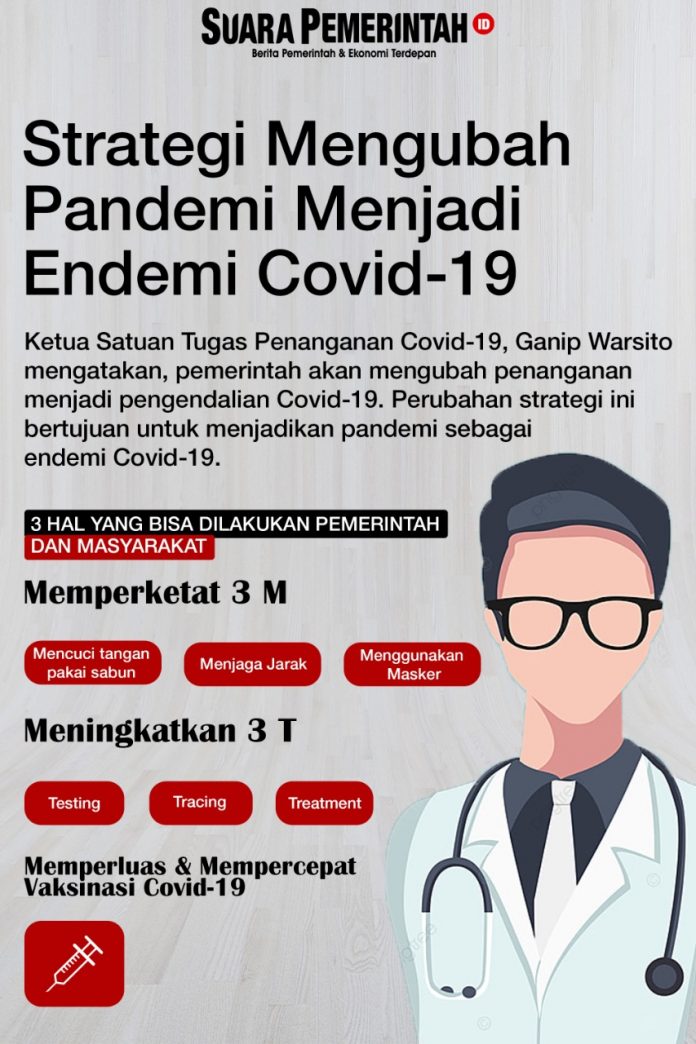 SuaraPemerintah.ID – Ketua Satuan Tugas Penanganan Covid-19, Ganip Warsito mengungkapkan, pemerintah bakal ubah penanganan menjadi pengendalian Covid-19. Perubahan strategi ini bertujuan untuk menjadikan pandemi sebagai endemi Covid-19.