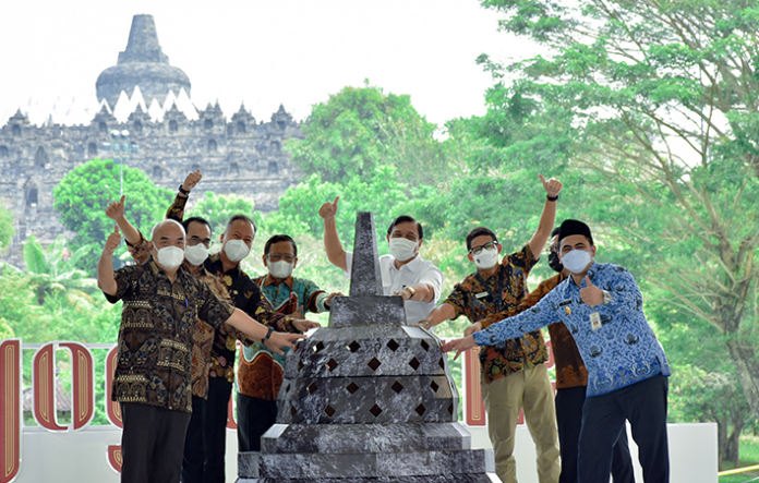 Menteri Koordinator Bidang Kemaritiman dan Investasi (Menkomarves) Luhut B Pandjaitan bersama Menteri Koordinator Bidang Politik, Hukum, dan Keamanan Mahfud MD didampingi oleh Menteri Perindustrian (Menperin) Agus Gumiwang Kartasasmita, Menteri Pariwisata dan Ekonomi Kreatif Sandiaga S Uno, Menteri Perhubungan Budi Karya Sumadi, Desa, Pembangunan Daerah Tertinggal, dan Transmigrasi Indonesia A. Halim Iskandar, serta Wakil Gubernur Jawa Tengah Taj Yasin Maimoen, secara resmi membuka Gernas BBI festival Joglosemar di Magelang, 20 Mei 2021.