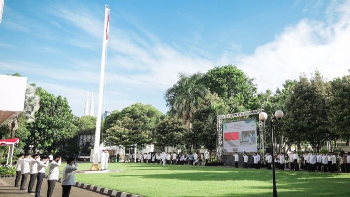Upacara HGN di lapangan Kantor Kemenag diawali dengan pengibaran bendera dan diikuti terbatas oleh ASN Kementerian Agama dengan menerapkan protokol kesehatan Covid-19.