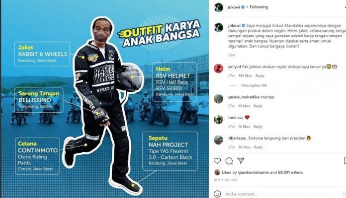 SuaraPemerintah.ID –Â Presiden Joko Widodo (Jokowi) perkenalkan pakaian yang digunakannya saat menjajal Sirkuit Internasional Mandalika melalui akun Instagramnya.