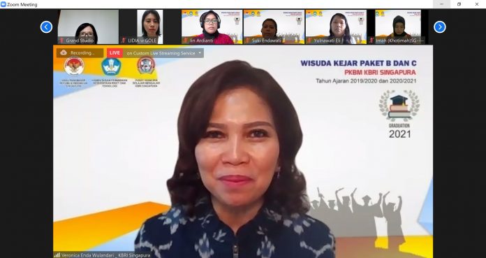 SuaraPemerintah.ID- Sebanyak 131 pekerja migran Indonesia di Singapura diwisuda setelah dinyatakan lulus Program Pendidikan Kesetaraan Paket B dan Paket C pada Pusat Kegiatan Belajar Masyarakat (PKBM) Kedutaan Besar Republik Indonesia (KBRI) Singapura, Minggu (12/12). Wisuda digelar virtual sehubungan peraturan pembatasan kegiatan yang masih diterapkan di Singapura.