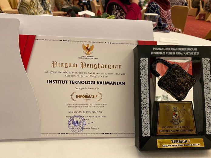 SuaraPemerintah.ID–Institut Teknologi Kalimantan berhasil meraih anugerah keterbukaan informasi publik se-Kalimantan Timur 2021 kategori perguruan tinggi di Kaltim dengan capaian “Informatif”. Pada capaian tersebut Institut Teknologi Kalimantan mendapatkan posisi 1 untuk keterbukaan informasi publik, perolehan poin yang didapatkan ITK adalah 95.6.