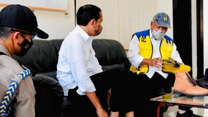Setelah itu, Presiden dan Menteri Basuki mencoba sepatu bot yang telah dipilih oleh keduanya.