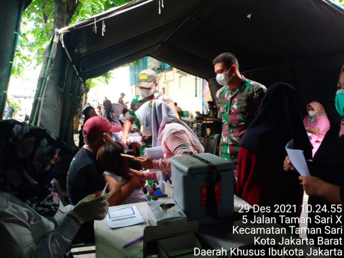 Serbuan vaksin yang dilaksanakan di halaman stadion sepak bola Tamansari Jalan Mangga Besar VI Utara dengan Nakes TNI dan Nakes Puskesmas Tamansari ini vaksin anak usia 6 hingga 11 tahun sebanyak 30 orang.