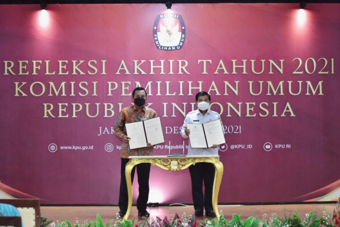 Adapun seremoni penandatanganan MoU tersebut diwakili oleh Pelaksana Tugas (Plt.) Sekretaris Jenderal (Sekjen) Kemendagri Suhajar Diantoro bersama Ketua KPU Ilham Saputra di Ruang Sidang Utama KPU RI Lantai 2 Menteng, Jakarta, Rabu (22/12/21).