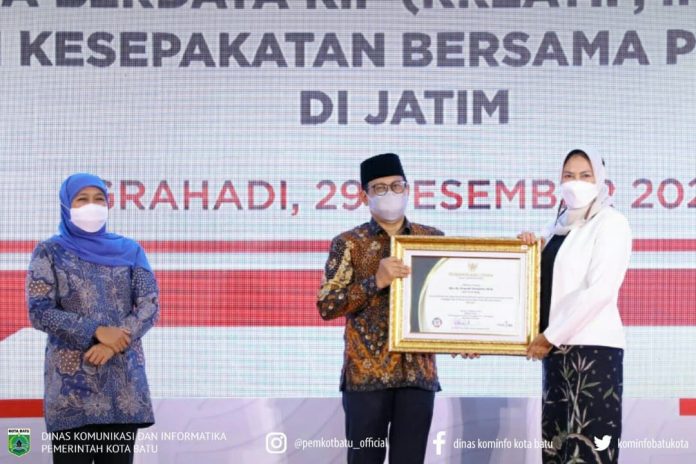 Penghargaan tersebut diberikan secara langsung oleh Menteri Desa, Pembangunan Daerah Tertinggal, dan Transmigrasi RI, Drs Abdul Halim Iskandar, dan disaksikan oleh Gubernur Jawa Timur Hj Khofifah Indar Parawansa, Rabu (29/12/21).