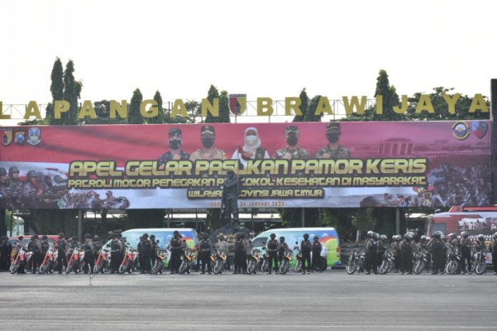 SuaraPemerintah.ID – Gubernur Jawa Timur, Khofifah Indar Parawansa memimpin apel gelar pasukan Pemor Keris (Patroli Bermotor Penegakan Protokol Kesehatan Masyarakat) di Lapangan Makodam V/Brawijaya, Senin (24/1/22).