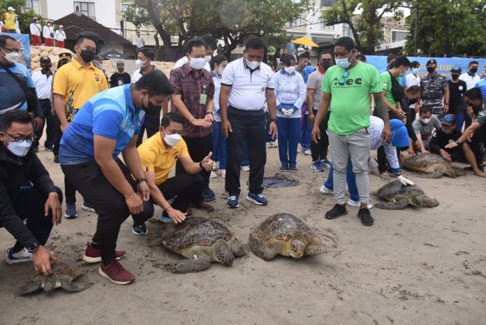 SuaraPemerintah.ID – Puluhan ekor penyu hasil sitaan TNI AL dilepasliarkan di Pantai Kuta, Kabupaten Badung, Provinsi Bali dengan pendampingan intensif oleh Balai Pengelolaan Sumberdaya Pesisir dan Laut (BPSPL) Denpasar salah satu unit pelaksana teknis Direktorat Jenderal Pengelolaan Ruang Laut (Ditjen PRL) Kementerian Kelautan dan Perikanan (KKP). Penyu-penyu yang terdiri dari penyu hijau (Chelonia mydas) dan penyu lekang (Lepidochelys olivacea) tersebut dilepasliarkan di koordinat 8° 43′ 22,854″ LS 115° 10′ 10,4196″ BT pada Sabtu, (8/1/22) lalu.