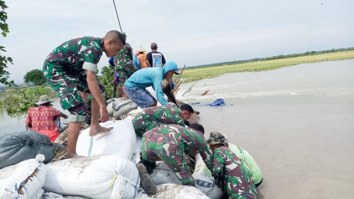 “Karya bakti ini melibatkan puluhan personel Babinsa dan elemen masyarakat untuk memperkuat dengan menimbun tanggul yang rusak dengan sak berisi pasir dan tanah,” ungkap Danramil 0813-10/Kanor, Lettu Inf Abdul Manan.