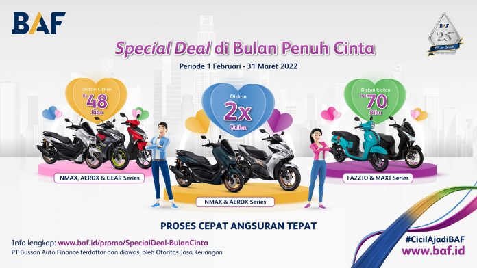 Yuk segera miliki skuter matik keren ini untuk menemanimu jalan-jalan bersama orang terkasih dengan #CicilAjadiBAF! Informasi lebih lengkap terkait promo pembiayaan motor baru Yamaha klik website BAF di sini https://www.baf.id/promo/SpecialDeal-BulanCinta. Selain itu, kamu juga bisa mengajukan pembiayaan melalui aplikasi BAF Mobile dengan mendownloadnya di Google Play Store dan App Store atau kunjungi Kantor Jaringan BAF terdekat di kotamu! Informasi lainnya hubungi BAF Care 1500750