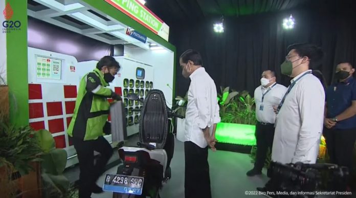 Sebelum menyampaikan sambutan, Presiden Jokowi juga menyempatkan diri untuk meninjau proses penukaran baterai listrik kendaraan yang dilakukan di Stasiun Penukaran Baterai Kendaraan Listrik Umum atau Battery Swapping Station di SPBU tersebut. Presiden menyampaikan bahwa proses penukaran baterai tersebut memakan waktu yang tidak lama.