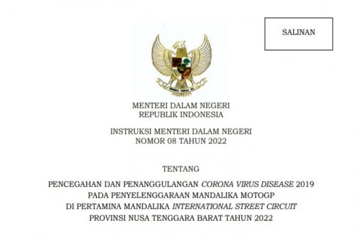 SuaraPemerintah.ID – Menteri Dalam Negeri (Mendagri) Muhammad Tito Karnavian menerbitkan Instruksi Mendagri (Inmendagri) Nomor 08 Tahun 2022 tentang Pencegahan dan Penanggulangan Corona Virus Disease 2019 pada Penyelenggaraan Mandalika MotoGP di Pertamina Mandalika International Street Circuit, Nusa Tenggara Barat Tahun 2022.