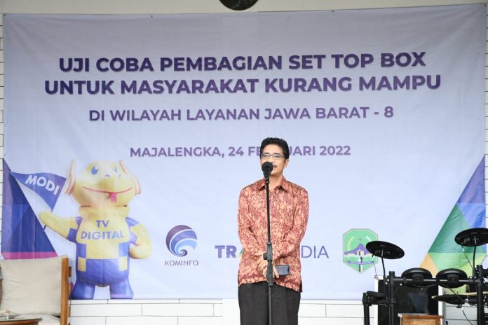 SuaraPemerintah.id– Dalam upaya mendukung program Pemerintah tentang penghentian siaran televisi analog (Analog Switch-Off/ASO) atau migrasi dari siaran televisi analog ke siaran televisi digital yang akan mulai berjalan pada bulan April 2022, Kementerian Komunikasi dan Informatika RI bekerjasama dengan Pemkab Majalengka serta PT. Televisi Transformasi Indonesia (TRANS TV) selenggarakan uji coba pendistribusian Set Top Box Gratis bagi warga yang kurang mampu di Kab.Majalengka, hal demikian juga sebagai ajang sosialisasi peralihan ASO kepada masyarakat Majalengka, bertempat di Taman Al-Latif Desa Kawunghlir-Majalengka, Kamis (24/02/2022).
