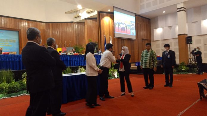SuaraPemerintah.ID – Mendes PDTT Abdul Halim Iskandar memberikan penghargaan pada Bupati Bojonegoro Anna Mu’awanah, Selasa (29/03/22) saat Pembukaan dan Kuliah Umum Mahasiswa Program RPL Desa Pemerintah Kabupaten Bojonegoro bekerjasama dengan Universitas Negeri Yogyakarta. Acara dilaksanakan secara luring dan daring melalui siaran langsung Youtube UNY Official.