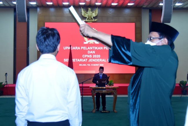 “Hari ini kita melakukan promosi, rotasi, mutasi, dan pelantikan CPNS menjadi PNS. Sumpah yang diucapkan harus bisa dipertanggungjawabkan, bukan hanya pada lembaga, tapi juga pada tuhan, bangsa, dan negara,” ujar Indra usai pelantikan di Gedung Nusantara IV, Senayan, Jakarta, Selasa (15/3/22).