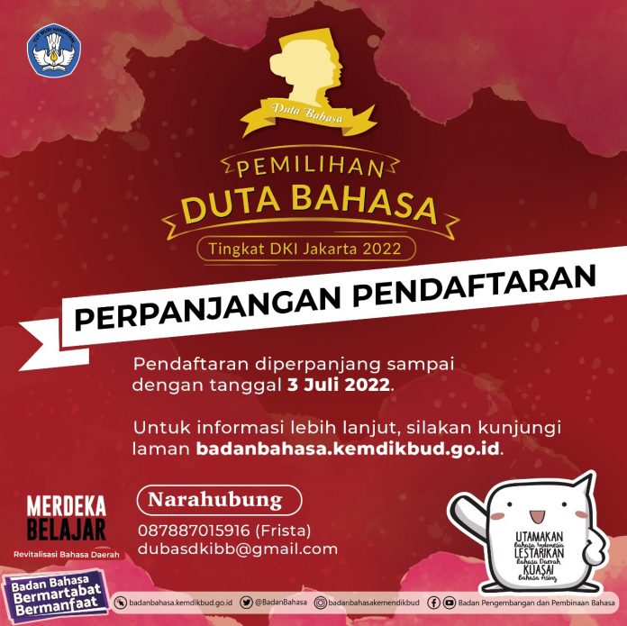 SuaraPemerintah.ID –Â Yuk bagi kalian yang ingin menjadi Duta Bahasa DKI Jakarta segera daftarkan diri kalian. Batas waktu pendaftaran Pemilihan Duta Bahasa Tingkat DKI Jakarta Tahun 2022 diperpanjang hingga 3 Juli 2022.