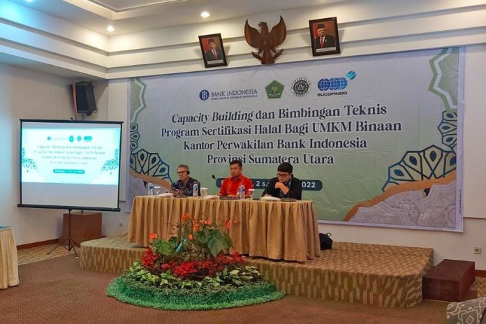 SuaraPemerintah.ID – PT SUCOFINDO mendukung UMKM melakukan sertifikasi Halal untuk memberikan nilai tambah dan daya saing. Sebagai salah satu Lembaga Pemeriksa Halal (LPH) yang ditunjuk oleh Pemerintah, PT SUCOFINDO menjelaskan proses sertifikasi halal pada kegiatan “Capacity Building & Bimbingan Teknis Program Sertifikasi Halal Bagi UMKM Binaan Kantor Perwakilan Bank Indonesia (KPwBI) Propinsi Sumatera Utara” yang diselenggarakan di Ballroom Hotel Grand Mutiara Berastagi pada tanggal 02 – 03 Juni 2022.