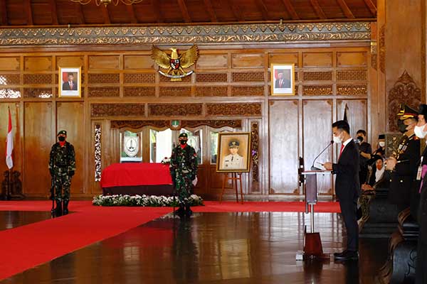 Gibran tampak terus mendampingi istri almarhum saat berjalan menuju ke dalam Pendapi Gede Balai Kota Solo. Sedangkan, sejumlah anggota keluarga mantan Wali Kota Solo meninggal itu terlihat berjalan di belakangnya.