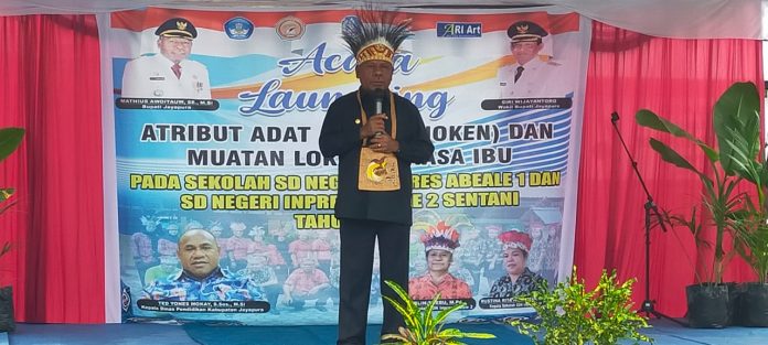 “Penerapan muatan lokal dan atribut adat di sekolah ini merupakan warna dari pada otonomi khusus itu sendiri, disini peran pendidik nampak, untuk bagaimana mencerdaskan peserta didik supaya wawasannya lebih luas untuk bisa mempertahankan jati dirinya,” ujar Bupati Mathius dalam sambutan sesaat sebelum melaunching muatan lokal dan atribut adat di SD Abeale 1 dan Abeale 2.