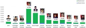 Secara agregat, tiga figur dengan jumlah follower tertinggi adalah Emil, Prabowo, dan Sandi. Namun, jumlah mentions terbanyak diraih Anies, Erick dan Ganjar. Pemicu percakapan untuk ketiga sosok yang disebut terakhir ini tidak lepas dari peran simpatisan loyal dan haters militan masing-masing yang tak pernah jemu beradu narasi.