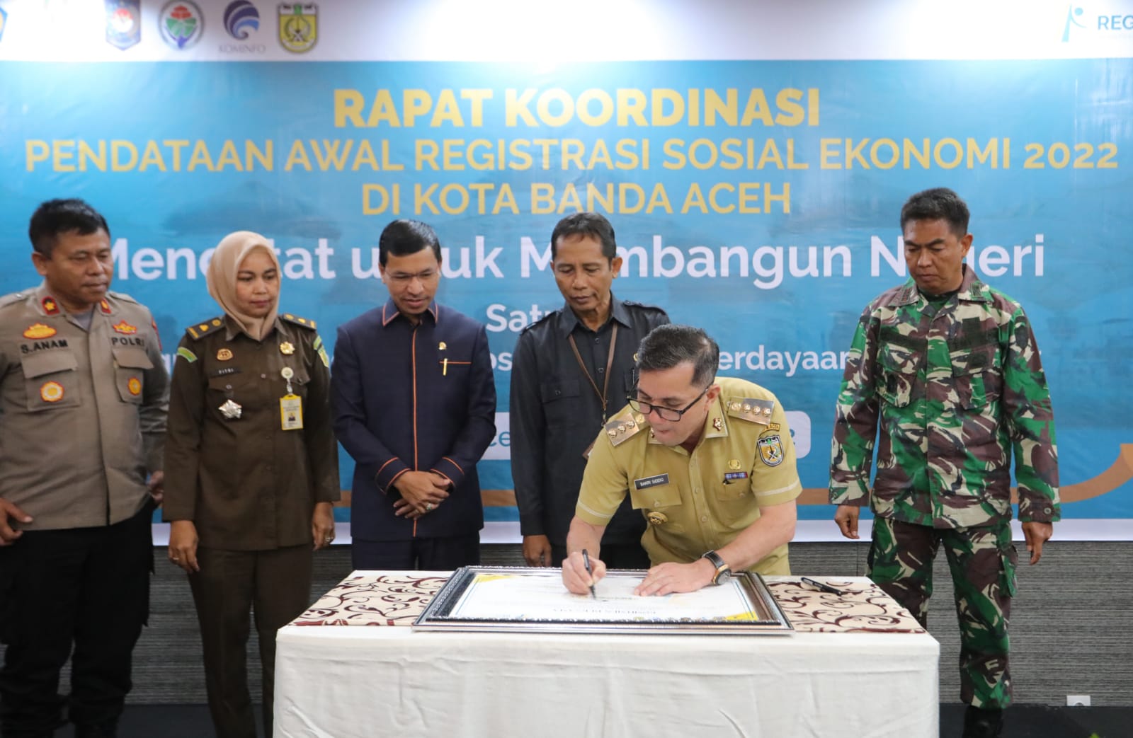 SuaraPemerintah.ID – Penjabat Wali Kota Banda Aceh Bakri Siddiq membuka secara resmi Rapat Koordinasi Pendataan Awal Registrasi Sosial Ekonomi (Regsosek) 2022 yang digelar Badan Pusat Statistik (BPS) Banda Aceh di Hotel Kyriad Muraya, Selasa, 27 September 2022.
