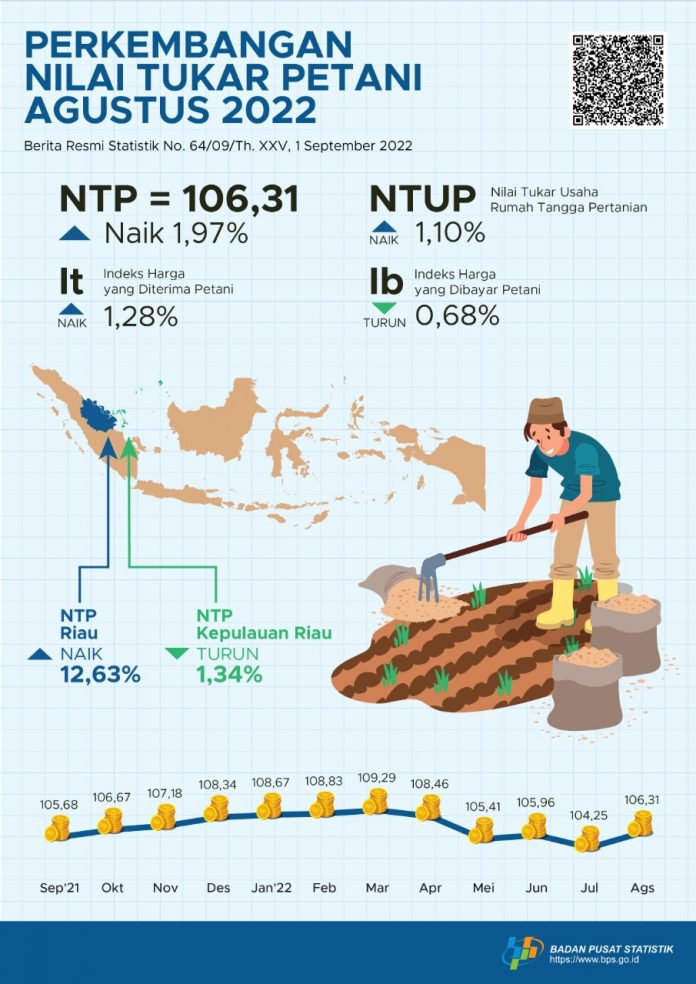 SuaraPemerintah.ID –Â Badan Pusat Statistik (BPS) merilis bahwa pada bulan Agustus 2022, Nilai Tukar Petani atau NTP di 27 Provinsi Indonesia mengalami kenaikan. Kenaikan tertinggi berada di Provinsi Riau yang mencapai 12,63 persen. Sementara untuk zona Pulau Jawa, kenaikan tertinggi berada di Provinsi Banten yang naik sebesar 2,27 persen.