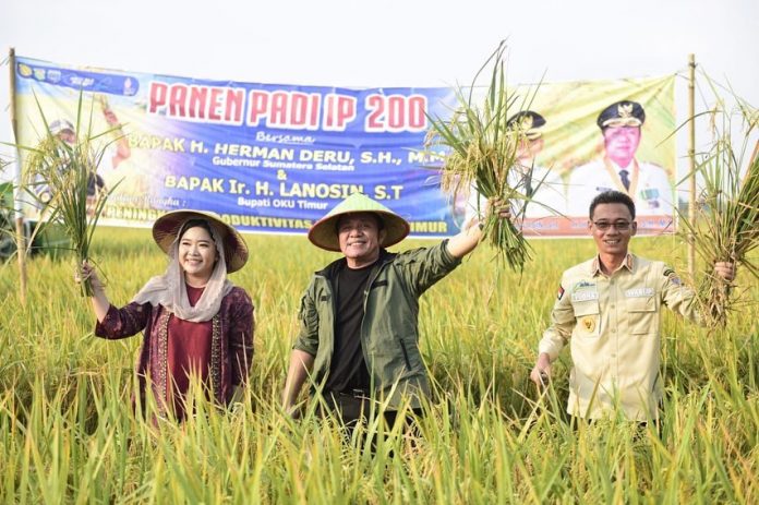 SuaraPemerintah.ID – Gubernur Sumsel H. Herman Deru panen padi IP200 sekaligus menanam pepaya california saat kunker ke Desa Minanga Tengah, Kecamatan Semendawai Barat, Kabupaten OKU Timur,(28/9/22) sore.