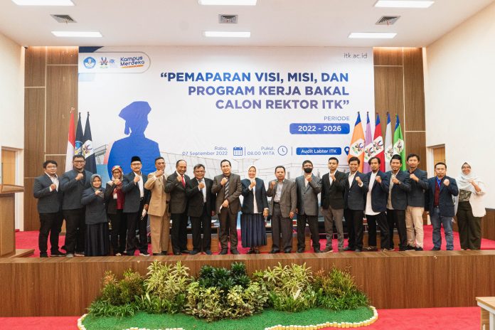 SuaraPemerintah.id-Institut Teknologi Kalimantan pada Rabu (07/09/2022) melangsungkan kegiatan pemaparan visi, misi, dan program kerja bakal calon Rektor Institut Teknologi Kalimantan periode 2022-2026. Kegiatan pemaparan tersebut berlangsung di Auditorium Laboratorium Terpadu Institut Teknologi Kalimantan dengan dihadiri oleh seluruh civitas akademik ITK. Pada agenda yang dilangsungkan turut hadir bakal calon rektor diantaranya Prof. Ir. Sukoso, M.Sc., Ph.D., yang berasal dari Institusi Universitas Brawijaya. Kemudian Prof. Dr.rer.nat Agus Rubiyanto, M.Eng.Sc. berasal dari Institut Teknologi Sepuluh Nopember. Selanjutnya Prof. Dr. Basuki Widodo, M.Sc. berasal dari Institut Teknologi Sepuluh Nopember, dan Prof. Dr. Susilo M.Pd berasal dari Universitas Mulawarman.