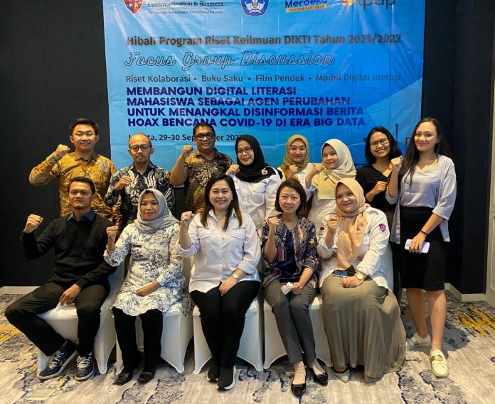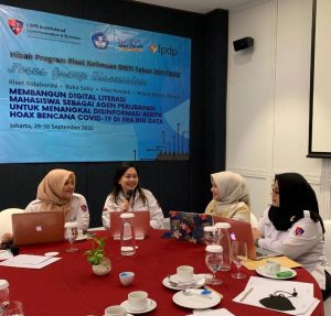 Tim Peneliti Institut Komunikasi dan Bisnis LSPR menyelenggarakan Focus Group Discussion mengenai Digital Literasi Mahasiswa Sebagai Agen Perubahan untuk Menangkal Disinformasi Berita Hoaks Bencana Covid-19 Di Era Big Data. Kegiatan ini dilaksanakan secara hybrid di Hotel Mercure dan dihadiri oleh perwakilan pemerintahan, akademisi, praktisi media, praktisi komunikasi, tenaga kesehatan, relawan, content creator dan mahasiswa/i.